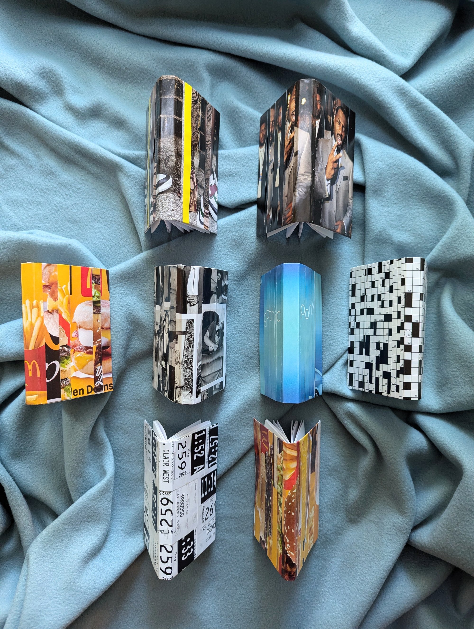 Hand-sewn, cut and bound, soft-cover pocket notebooks, each with a unique collage pattern on the outside cover.