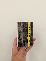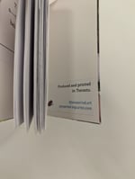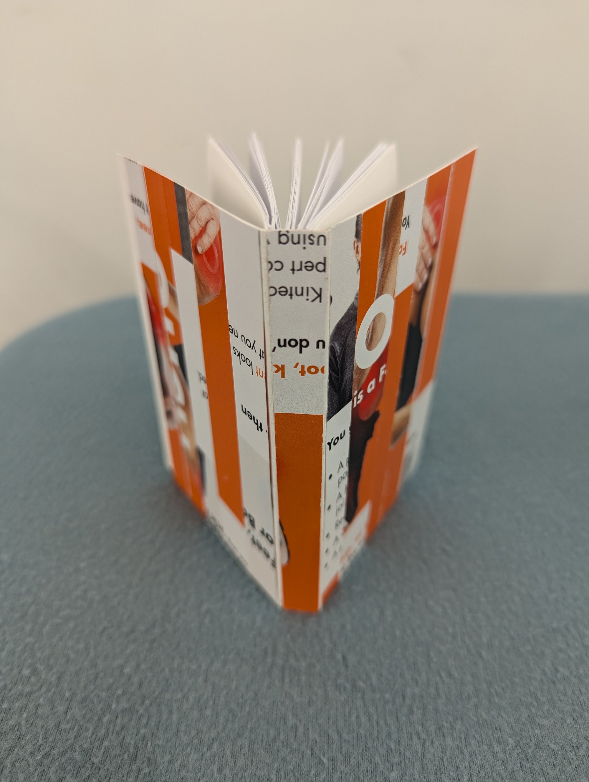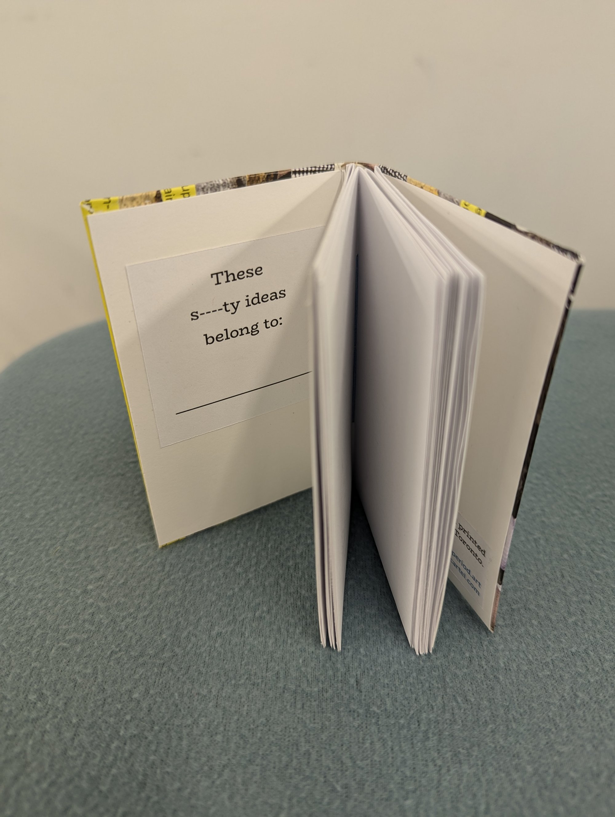 Hand-sewn, cut and bound, soft-cover pocket notebooks, each with a unique collage pattern on the outside cover.
